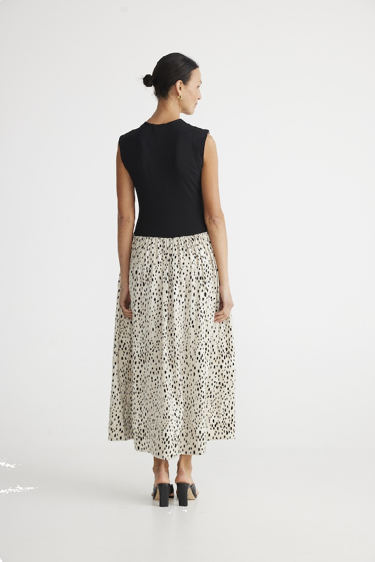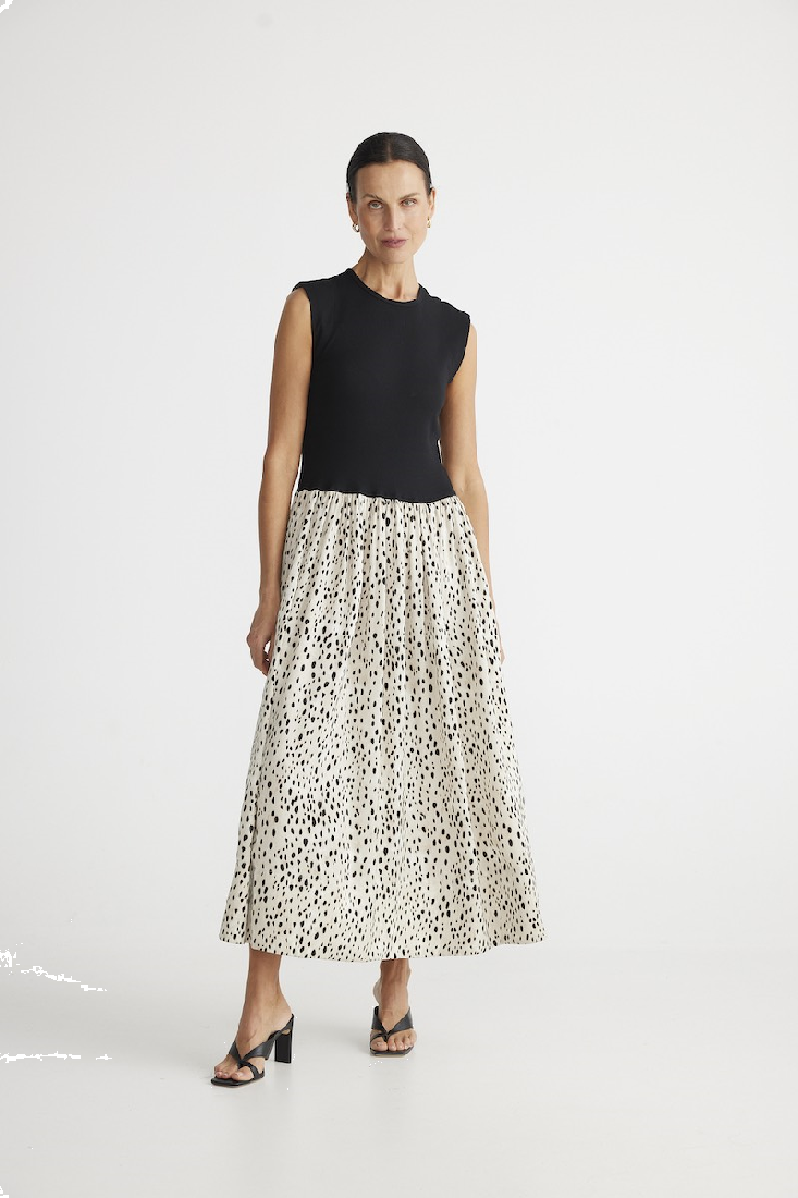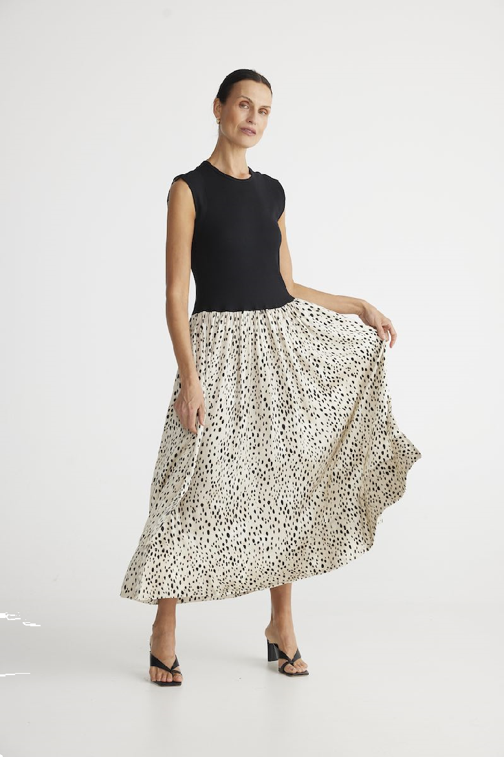 The Daphne Dress Ocelot Print Brave And True is a stylish fitted dress that will make you feel super feminine. It features a fitted ribbed jersey bodice leading to a floaty silky satin skirt with gathering. It has side seam pockets and side splits in the full length skirt. Wear it as is or elevate the look with a wide leather belt.
